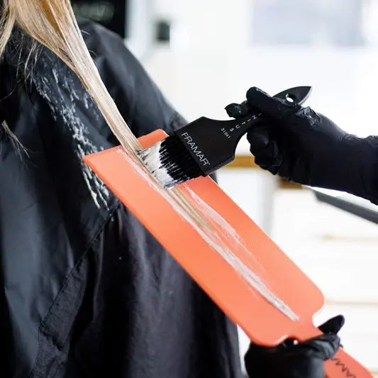 De Framar Board & Paddle – Paddle Pack is een essentiële toolset voor coloristen die werken met balayage, highlights en ontkleuringstechnieken. De set bevat twee paddles met een ruim werkoppervlak, ontworpen voor optimale controle en efficiëntie tijdens het kleuren. De zwarte paddle is ideaal voor precisiewerk en kortere secties, terwijl de perzikkleurige paddle perfect is voor langere lengtes en grotere haarpartijen. Dankzij het doordachte ontwerp werk je snel, nauwkeurig en gecontroleerd, zelfs dicht tegen de hoofdhuid.