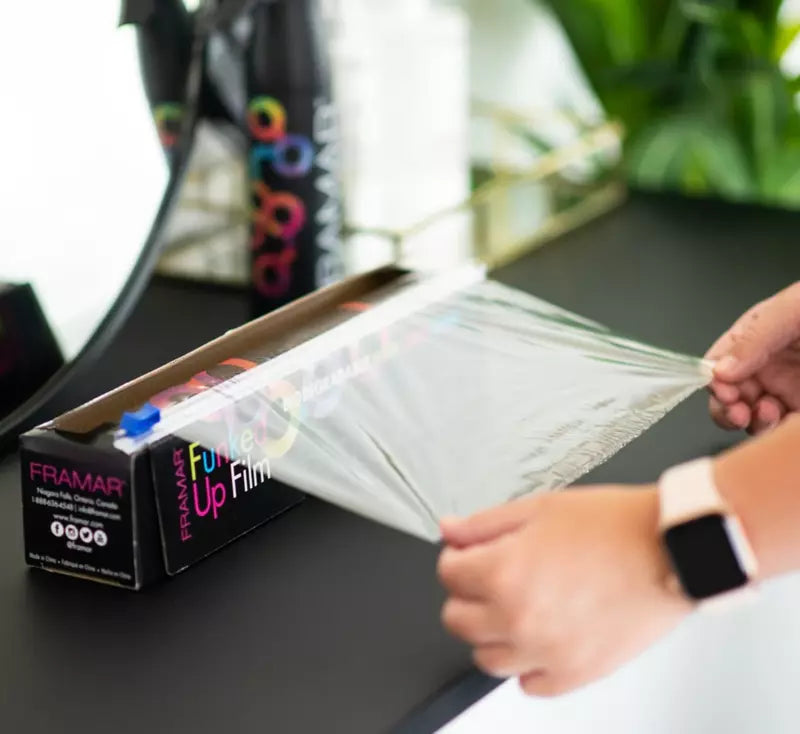 De Framar Funked Up Film Clear is een revolutionaire, biologisch afbreekbare folie speciaal ontworpen voor creatieve kleurtechnieken zoals color blocking en balayage. Deze zero-cling folie is flexibel, plakt niet aan zichzelf en is daarmee ideaal voor het secuur scheiden van lokken tijdens het aanbrengen van kleur. De zachte, soepele textuur zorgt voor een natuurlijke grip op het haar, waardoor de folie moeiteloos op z’n plek blijft zonder te verschuiven. Geschikt voor gebruik met de Framar Balayage Bestie of direct vanaf de rol te knippen in de gewenste lengte.